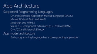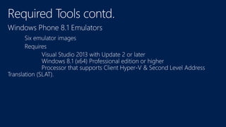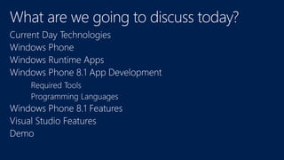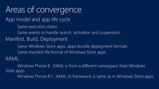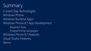 This document summarizes application development tools and platforms. It outlines the release history of Visual Studio 2013 and updates, how Windows Runtime apps can be developed for both Windows and Windows Phone using common APIs and languages. It also describes new features in Windows Phone 8.1 like universal app templates and the ability to target both Windows and Windows Phone from a single project. The document concludes by thanking the reader and providing a link to the author's blog for more information.