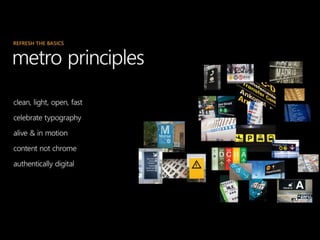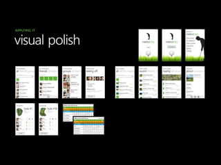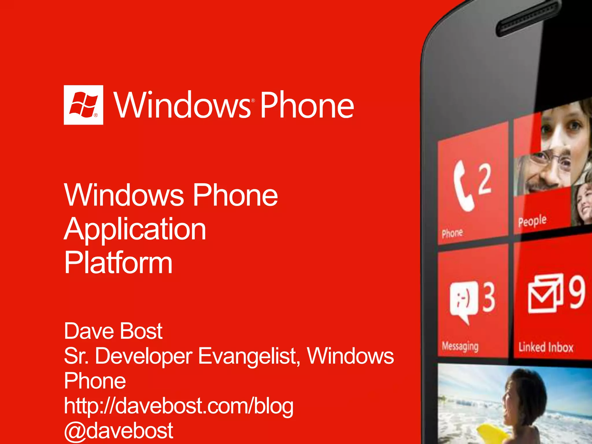 The document discusses key features of the Windows Phone application platform. It highlights how Windows Phone puts people at the center through integration with social networks like Facebook and Twitter. It also discusses how apps can be pinned to the start screen for live updates, and how the Windows Phone app model and tools make developing apps easier. The document also provides an overview of the Windows Phone emulator, profiler, and Marketplace for submitting apps.