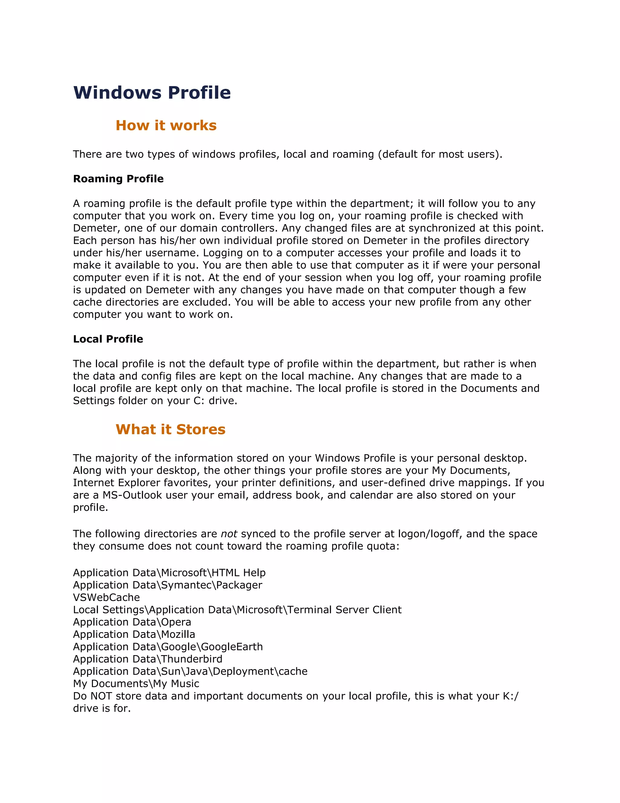 A roaming profile stores a user's files and settings on a domain controller and loads them onto any computer the user logs into, allowing a consistent environment. A local profile only stores files on the local machine. A roaming profile syncs changes made during a session back to the domain controller upon logout. Files like browser caches and music are excluded from syncing to save space. Users should store large files on network drives, not their profiles, to avoid exceeding size limits.