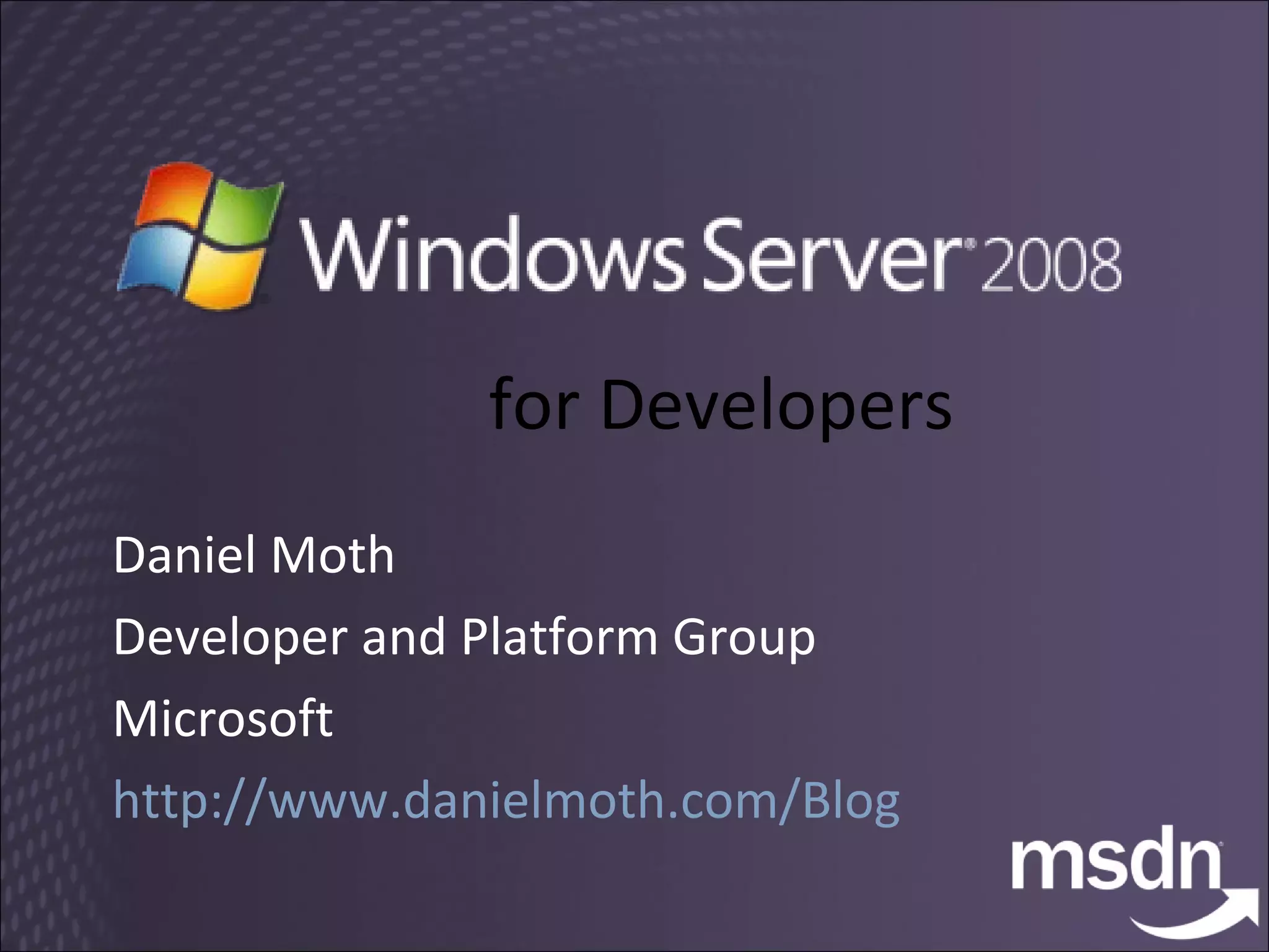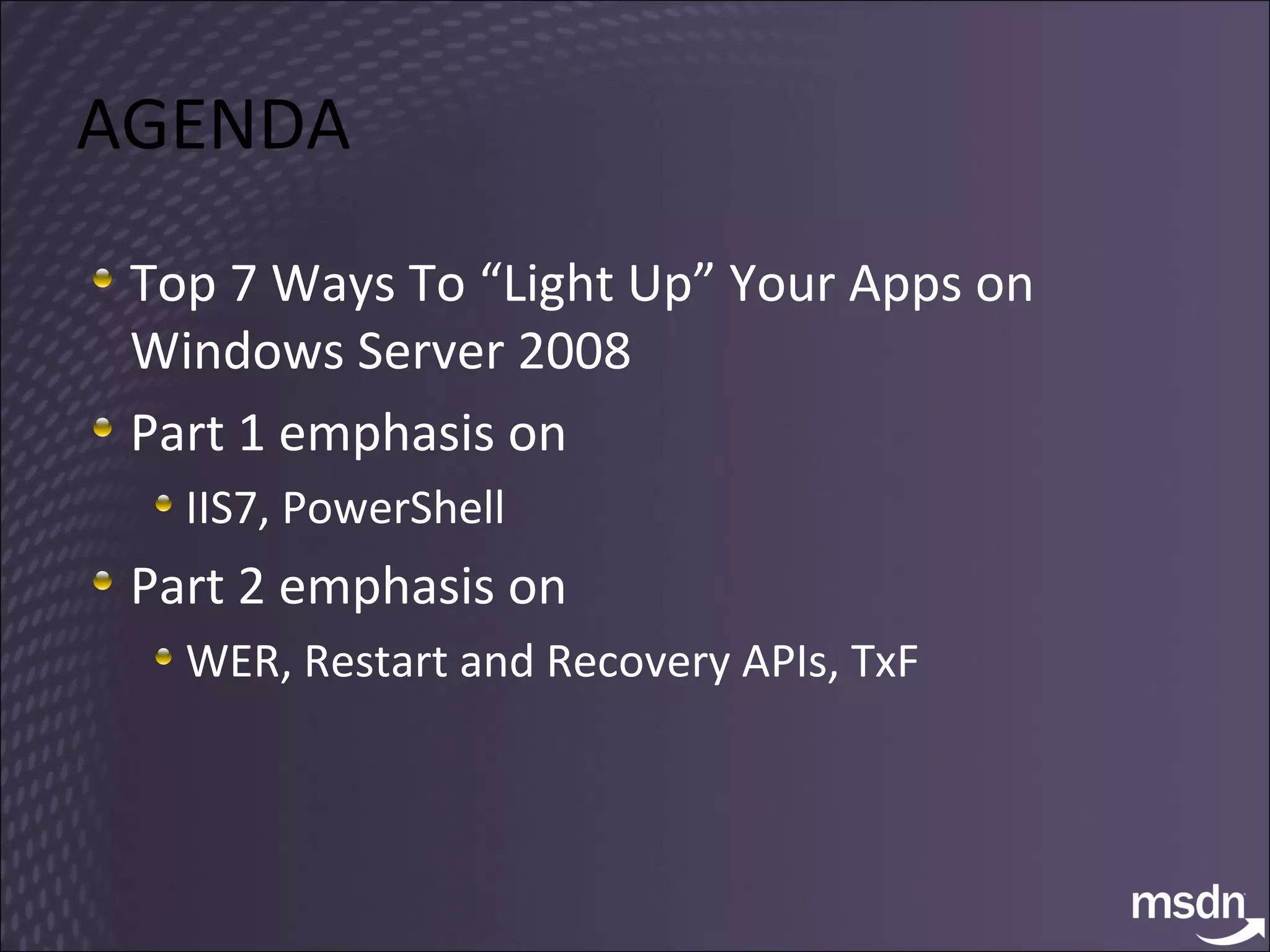 The document discusses strategies for enhancing application performance on Windows Server 2008, focusing on various technologies such as IIS7, PowerShell, and enhancements in threading and virtualization. It highlights seven key approaches for developing more flexible, manageable, and reliable applications, including error handling with Windows Error Reporting and the Restart Manager. Additionally, virtualization technologies and capabilities, particularly with Hyper-V, are emphasized for improved resource utilization and high availability.