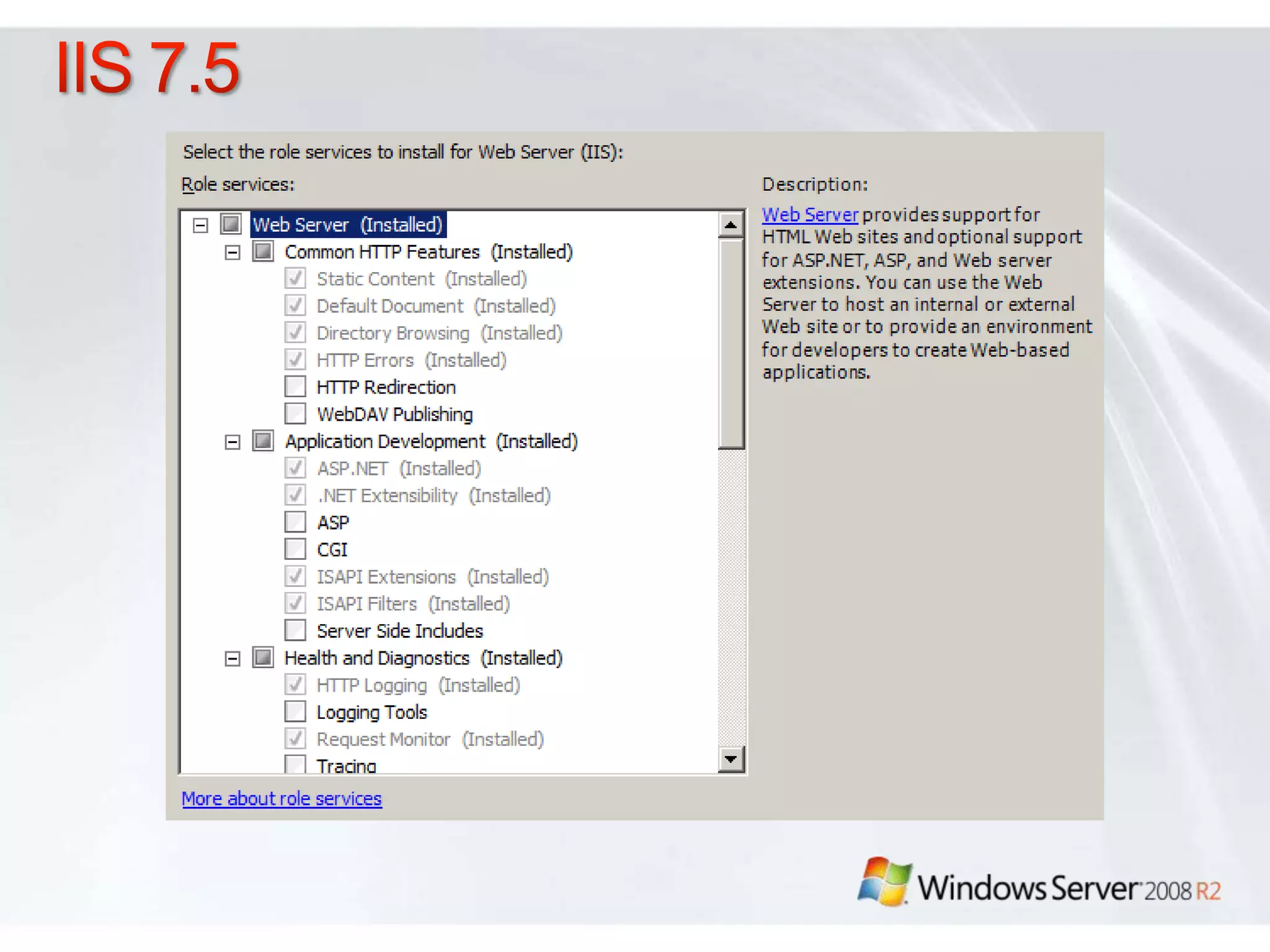 This document summarizes the key features and capabilities of Windows Server 2008 R2 including virtualization, management, web hosting, scalability, reliability, integration with Windows 7, and power management features. It discusses Hyper-V, PowerShell, IIS 7.5, ASP.NET, best practices analysis, Live Migration, 64 logical processor support, componentization, storage performance, backup and recovery, and reduced memory and power footprint.