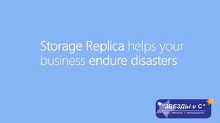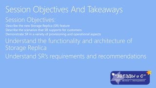 The document discusses the features and functionalities of Storage Replica, including its capabilities for synchronous and asynchronous replication over SMB 3.1.1. It highlights various use cases, management tools, performance metrics, and distinctions from other replication technologies. Additionally, the document emphasizes the importance of system requirements, log management, and optimizations for effective data replication across clusters.