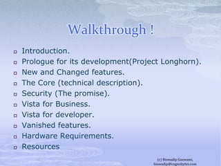 The document provides a comprehensive overview of Windows Vista, detailing its development history, features, and system requirements. It outlines significant updates in security, usability, and performance, including the introduction of the User Account Control (UAC) and enhancements like Windows Aero and BitLocker. Additionally, it explains Vista's various editions tailored for different users, emphasizing its deployment improvements for business environments.