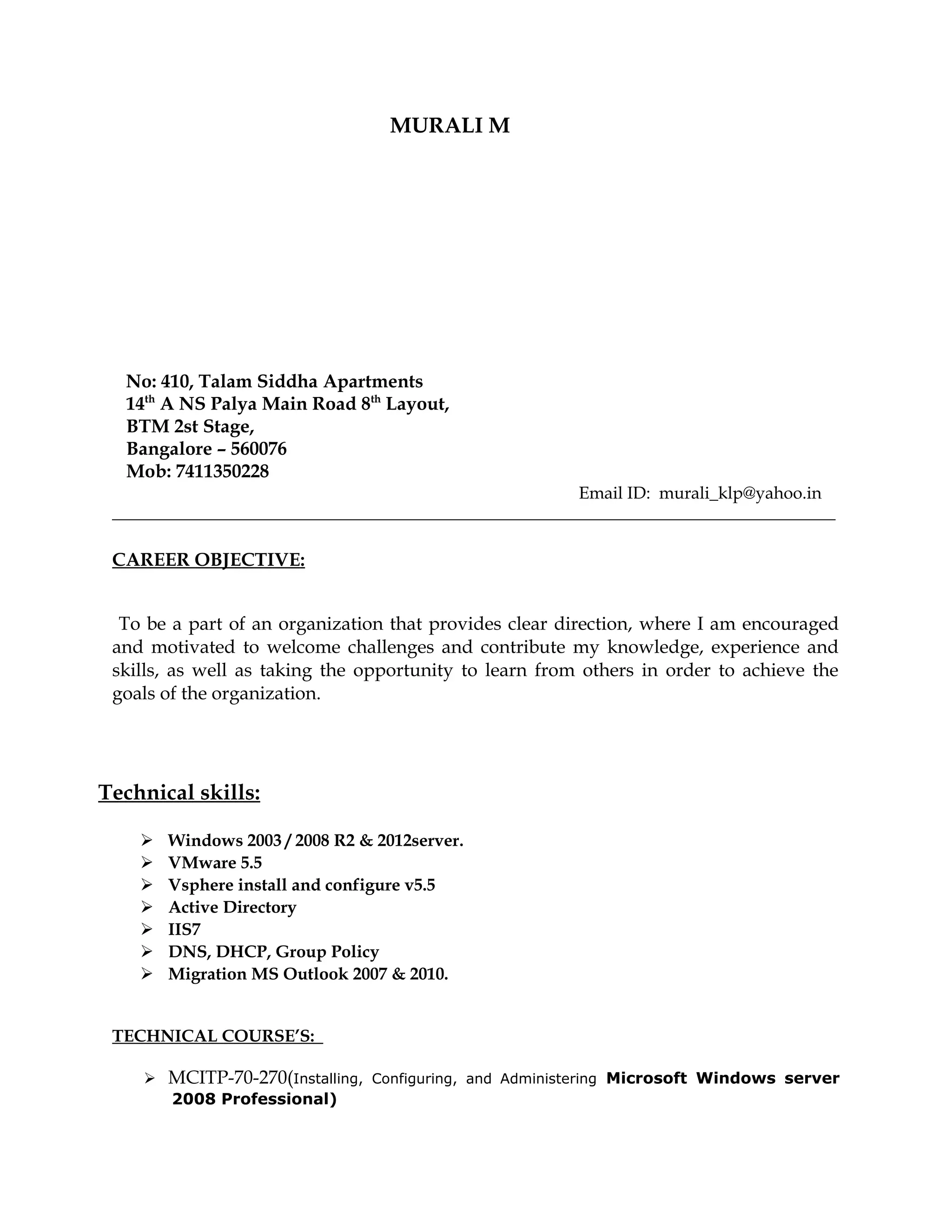 Murali M is a Windows and VMware administrator with over 4 years of experience. He has technical skills in Windows 2003/2008/2012 servers, VMware 5.5, Active Directory, IIS, DNS, DHCP and Group Policy. He has certifications in MCITP for Windows Server 2008 and VMware Vsphere 5.5. Currently working as a Windows and VMware admin at iGate, his responsibilities include managing ESXi servers, vCenter, virtual machines, Active Directory, and providing technical support. He has experience in server installation, configuration, maintenance and troubleshooting.