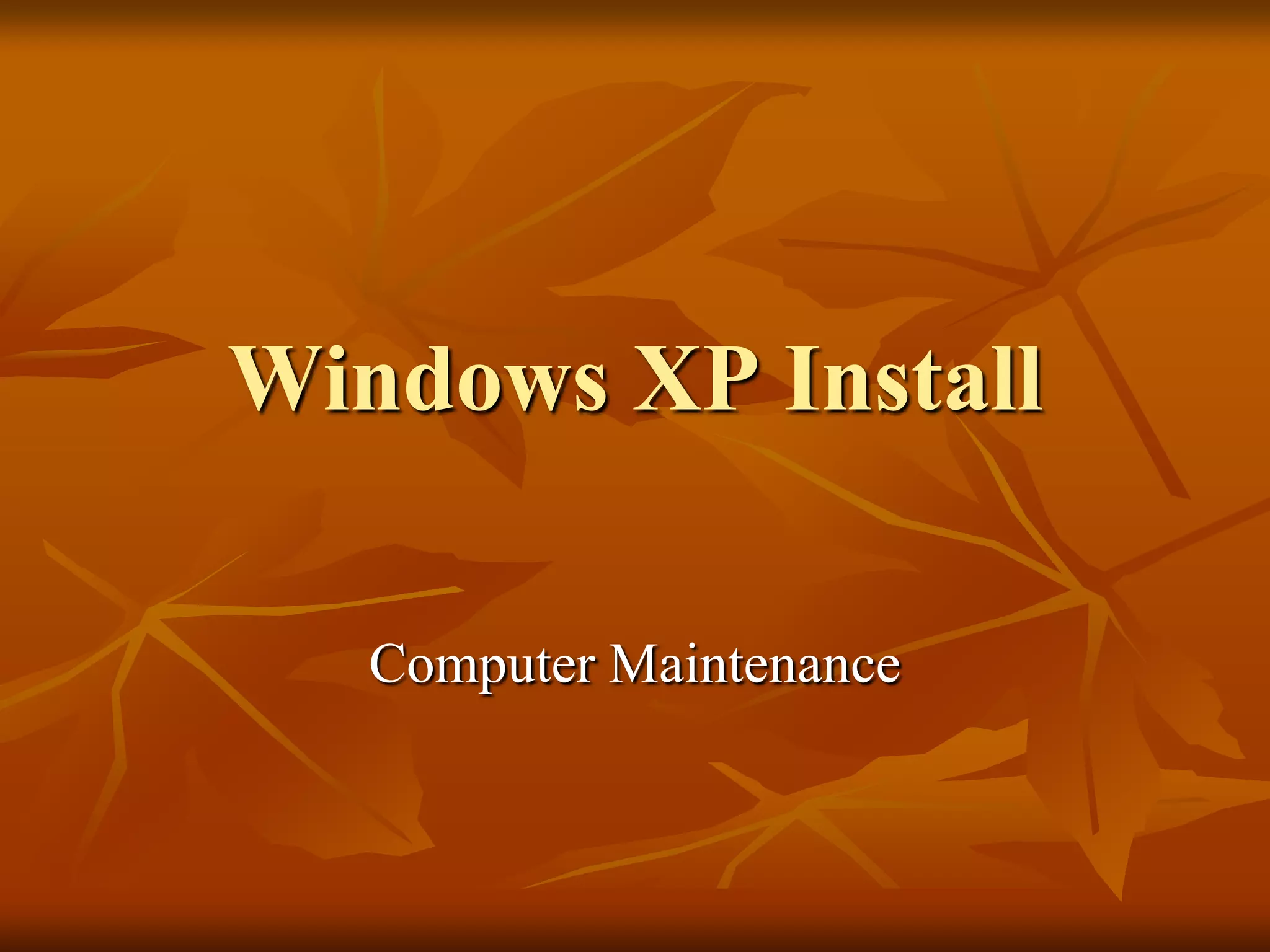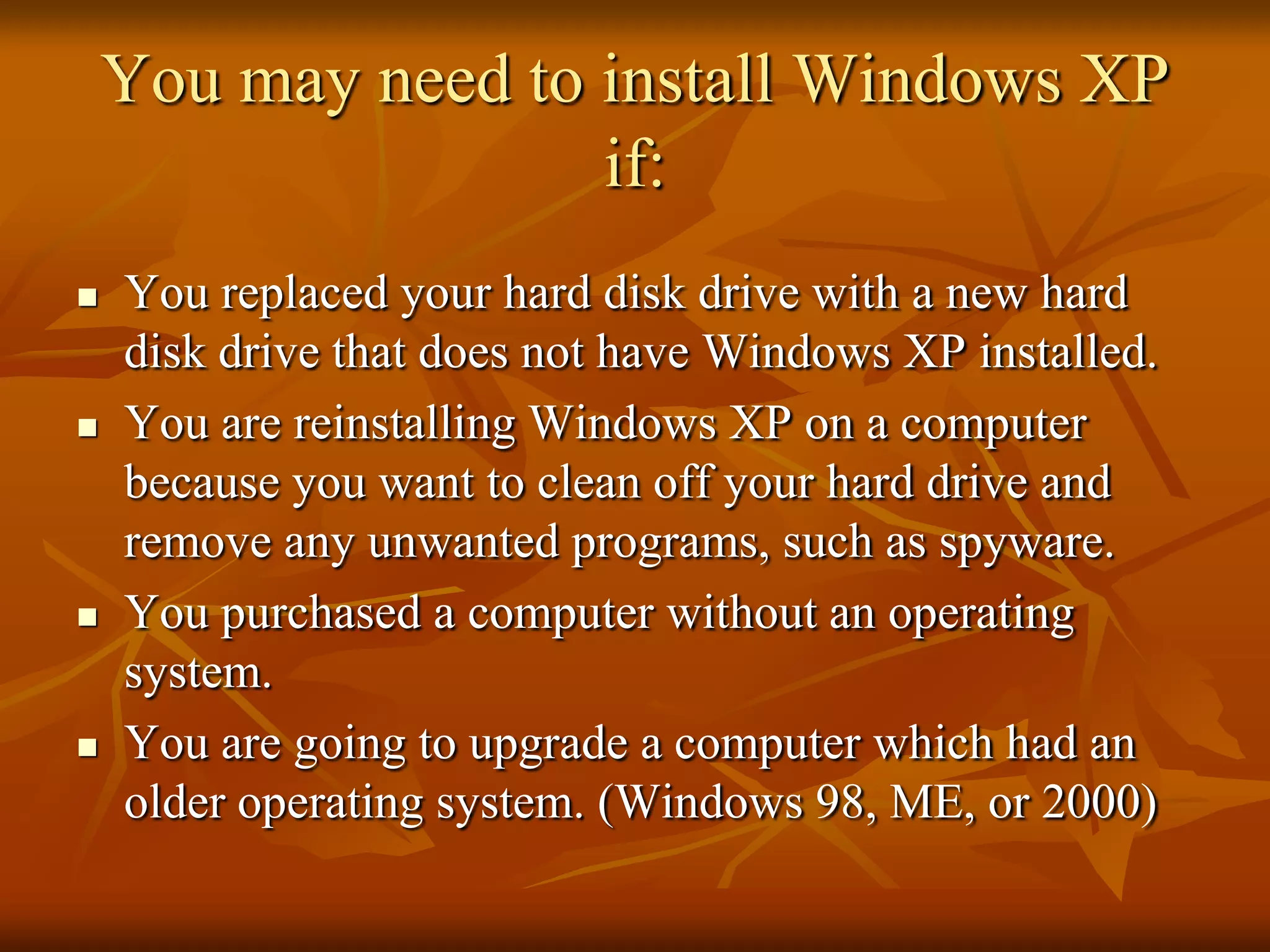 The document provides instructions for installing Windows XP on a computer. It lists reasons for needing to install Windows XP, such as replacing a hard drive or reinstalling to remove unwanted programs. It outlines the pre-installation checklist including having the Windows XP CD and product key. The installation process is divided into three parts: starting the installation by booting from the CD, continuing the installation by personalizing settings, and completing the installation which takes 20-30 minutes to configure the computer.