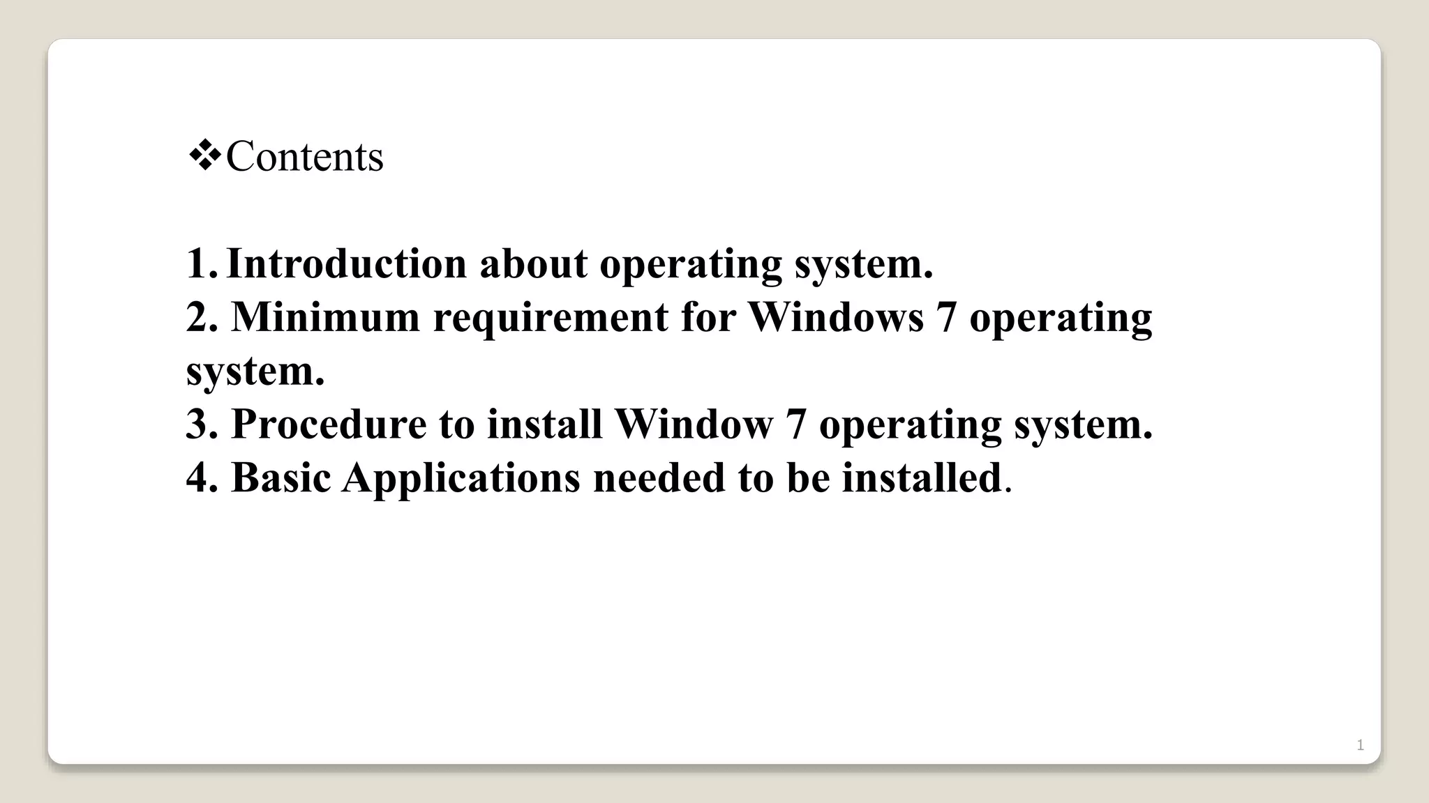 This document provides instructions for installing Windows 7 operating system. It begins with minimum system requirements including a 1 GHz processor, 1 GB RAM, 16 GB storage, and 128 MB graphics memory. The steps for installation are outlined, beginning with booting from a DVD or USB drive, selecting language and time settings, accepting license terms, selecting a drive to install on, and completing the installation process. Basic applications that should be installed are also listed such as antivirus software, a browser, Adobe Reader, and printer drivers.