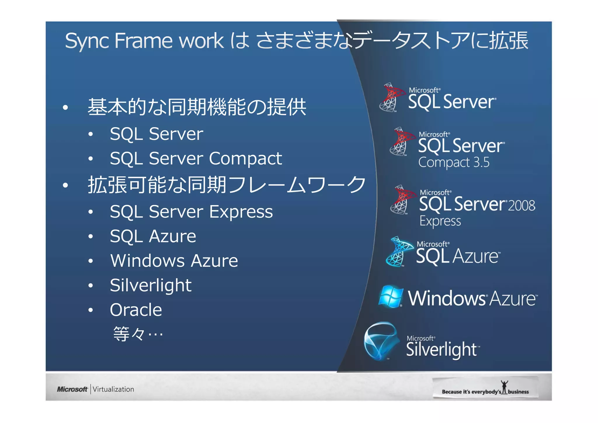 Synchronize() { // Sync Orchestrator の⽣成 SyncOrchestrator syncOrchestrator = new SyncOrchestrator(); // Sync Provider の⽣成と設定 syncOrchestrator.LocalProvider = new SqlSyncProvider("Sync_Database1", new SqlConnection(@”Datasource=(local)......")); syncOrchestrator.RemoteProvider = new SqlAzureSyncProvider("Sync_Database1" @"Server=tcp:[SERVERNAME].database......")); // 同期順序の設定 syncOrchestrator.Direction = SyncDirectionOrder.DownloadAndUpload; // 同期の実⾏ syncOrchestrator.Synchronize(); }