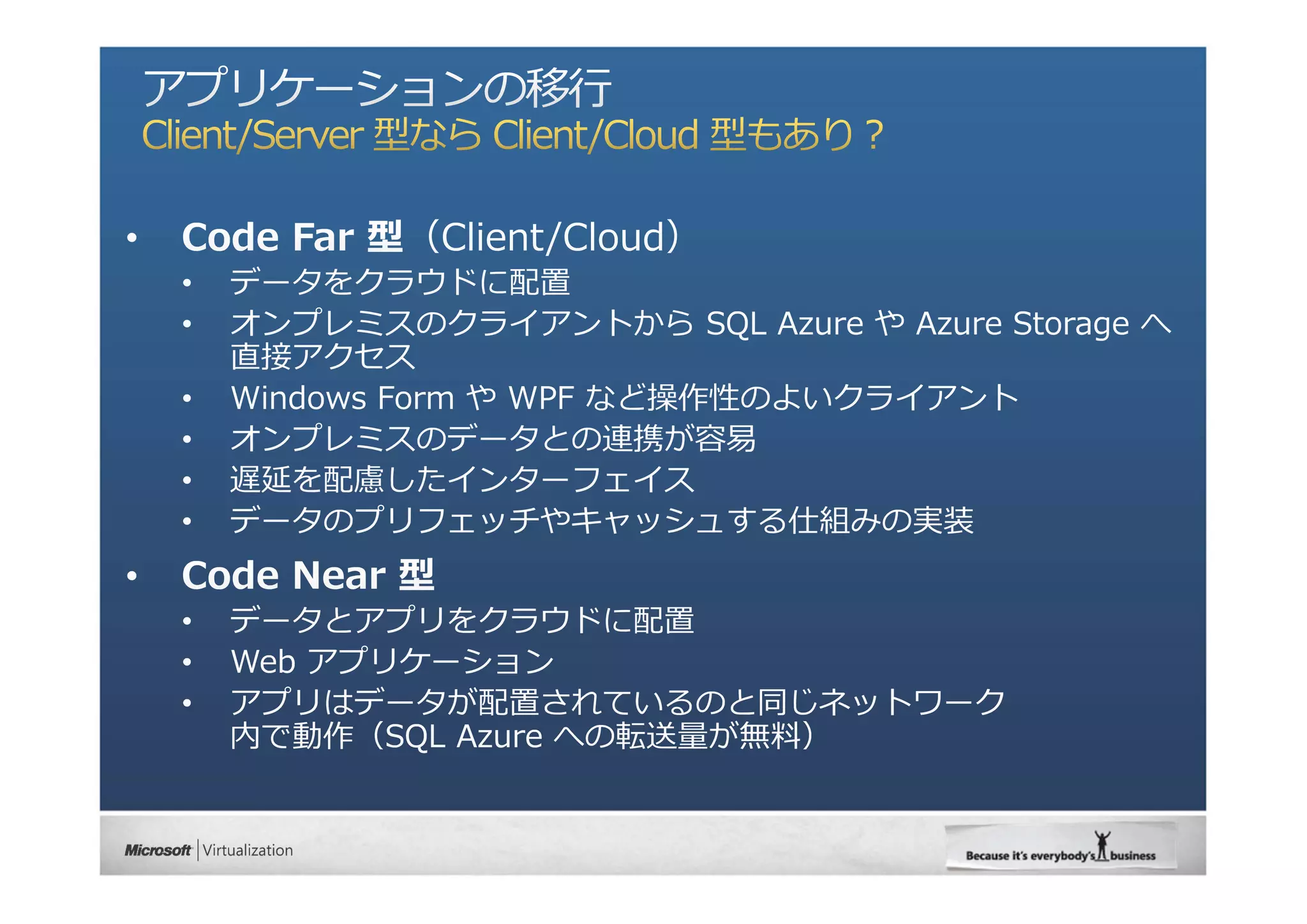 当セッションにご参加いただき、ありがとうございます。本資料は 「Microsoft Virtualization Summit 2010 MS-9 『Windows Azure の⻑所を活かすクラウド アプリ開発』」の⼿元参照⽤資料です • 諸事情により、セッションで表⽰する資料とは内容が異なる場合がご ざいます • 本資料の記載事項は、弊社の⼀般的な製品の⽅向性に関する概要を説 明するものです。また、情報提供を唯⼀の⽬的とするものであり、い かなる契約にも組み込むことはできません。以下の事項は、マテリア ルやコード、機能を提供することを確約するものではなく、製品に関 して記載されている機能の開発、リリースおよび次期については、弊 社の裁量により決定されます
