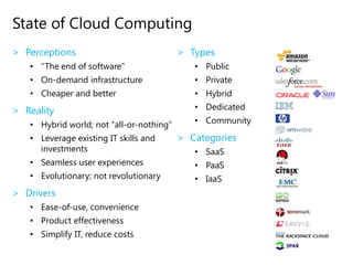 This document provides an overview of the Microsoft Azure cloud platform, including its capabilities and services. It discusses Microsoft's experience in the cloud with services like Outlook.com, Xbox Live, and Bing. It also provides examples of how companies have used Azure, such as a vehicle data website using it for overflow capacity, a call center leveraging web services on Azure, and an online education tool saving on development costs. Overall, the document promotes Azure as a scalable and cost-effective cloud platform for developing and hosting a variety of application types and models.