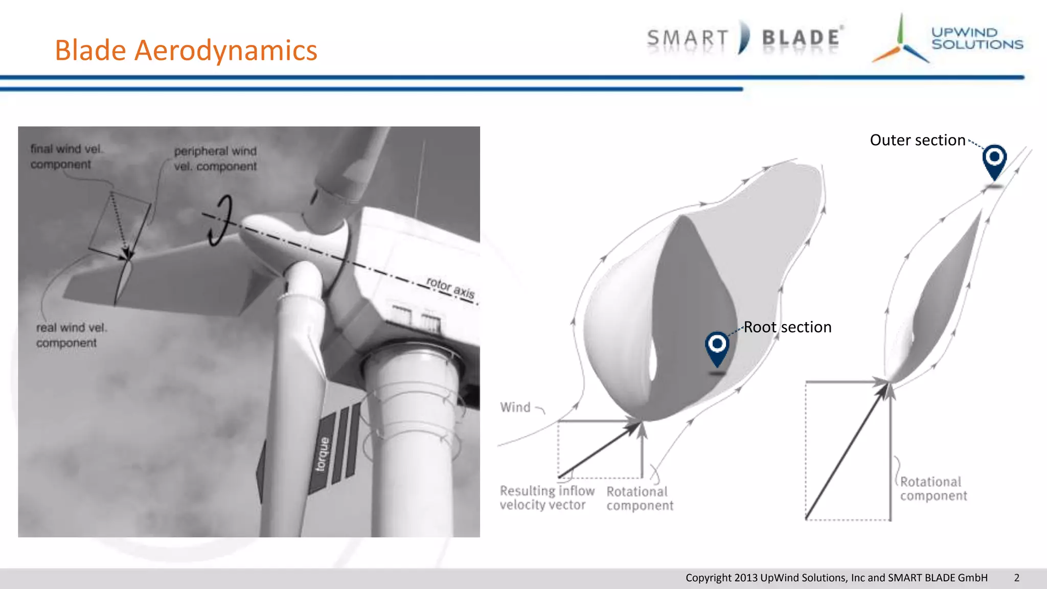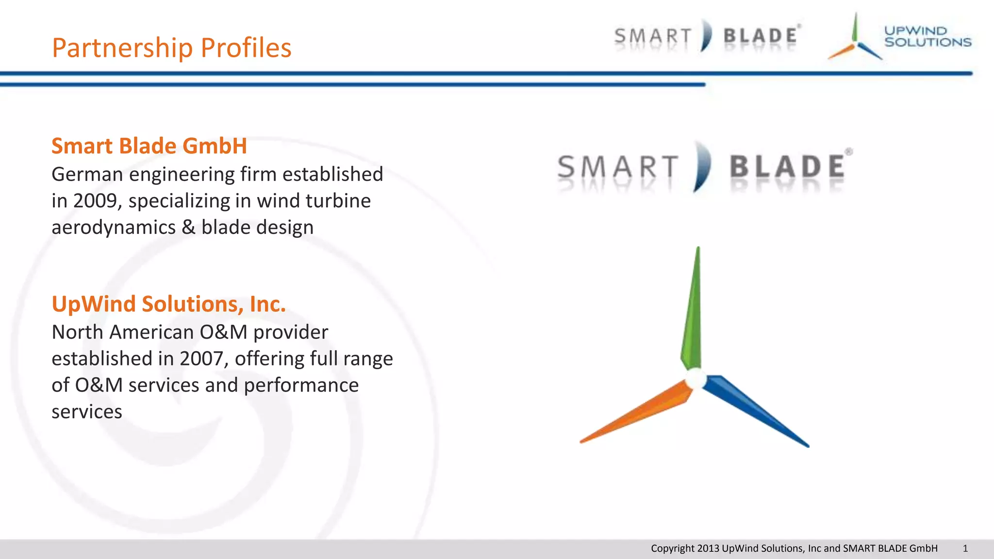 This document discusses vortex generators (VGs) that can be installed on wind turbine blades to improve their aerodynamic performance and energy production. It describes Smart Blade GmbH and UpWind Solutions' process for developing, testing, installing and analyzing the impact of customized VG solutions. Their VG design, installation procedure and testing aims to maximize energy production through stall delay and lift enhancement while minimizing noise and structural loads on the turbine. Case studies show VGs can increase annual energy production by 2-3% providing a strong return on investment.