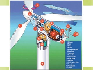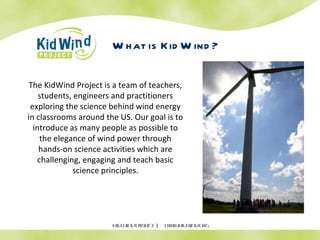 The document discusses different types of wind turbines, including their components and how they work. It covers vertical axis and horizontal axis turbines, comparing their advantages and disadvantages. It also discusses factors that impact turbine performance like airfoil design, blade composition, number of blades, drive trains, controls, towers, and more. The goal is to introduce students to the science of wind power through hands-on activities.