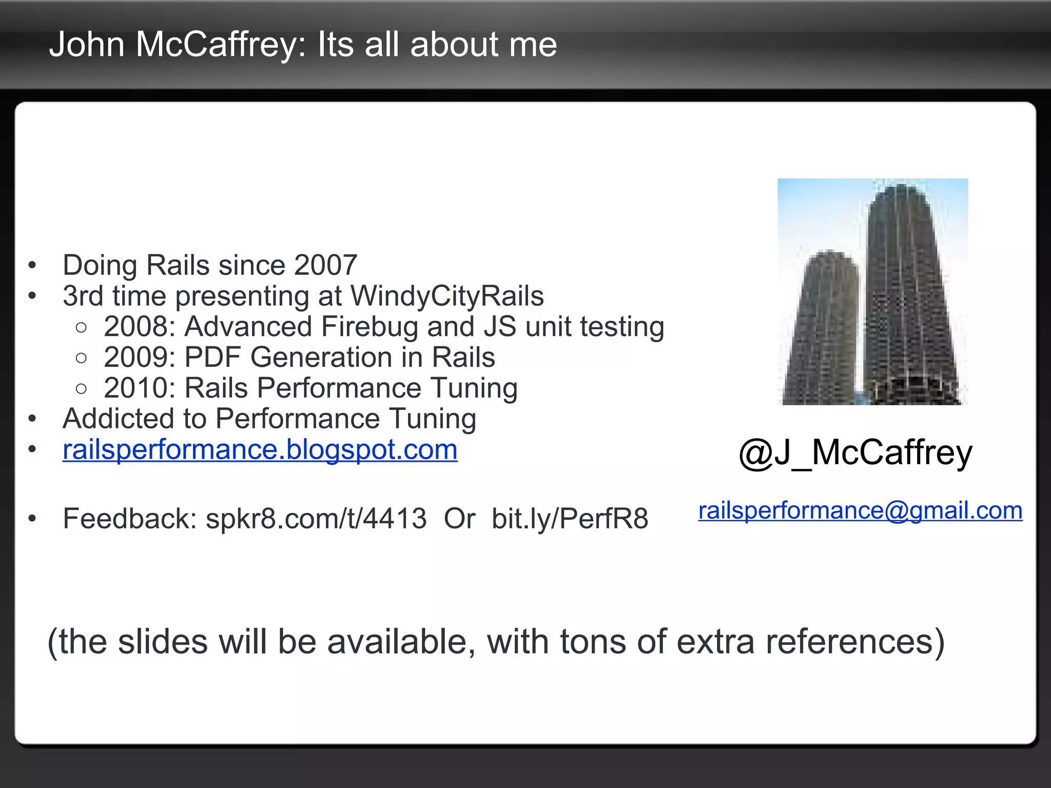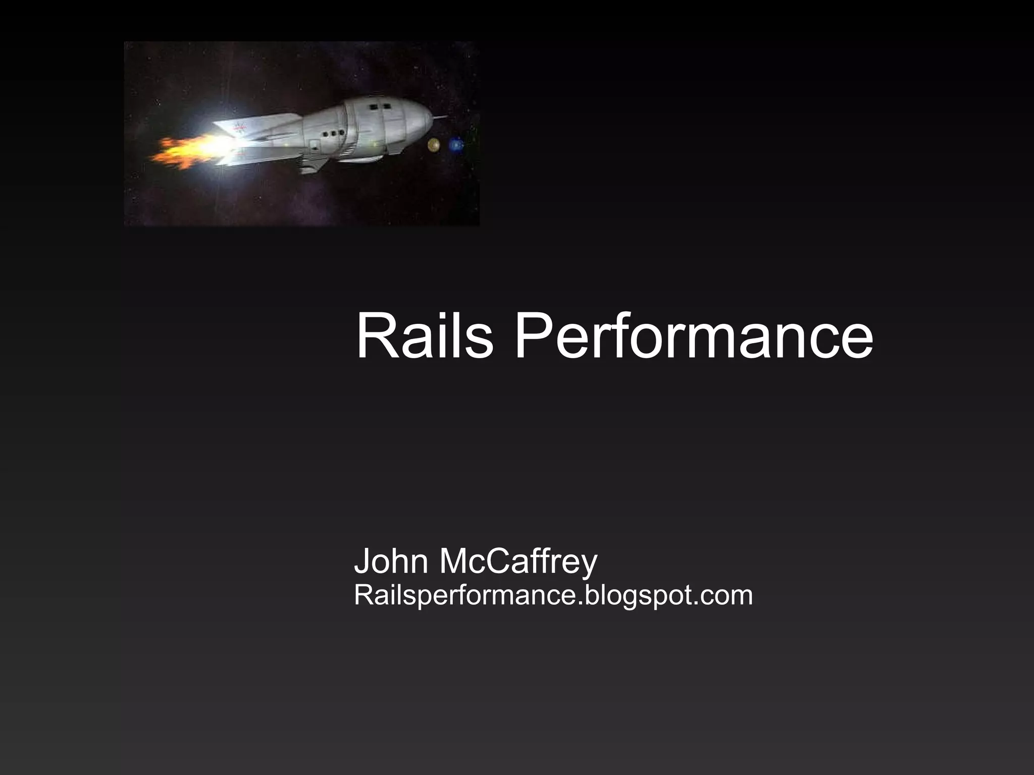 John McCaffrey's presentation focuses on performance tuning in Rails, covering methods for measuring and improving page load times, server performance, and database issues. He emphasizes the importance of planning, measuring, and optimizing performance to enhance user experience and business outcomes. The document also includes practical tools and techniques for developers to implement, such as minimizing HTTP requests and utilizing caching strategies.