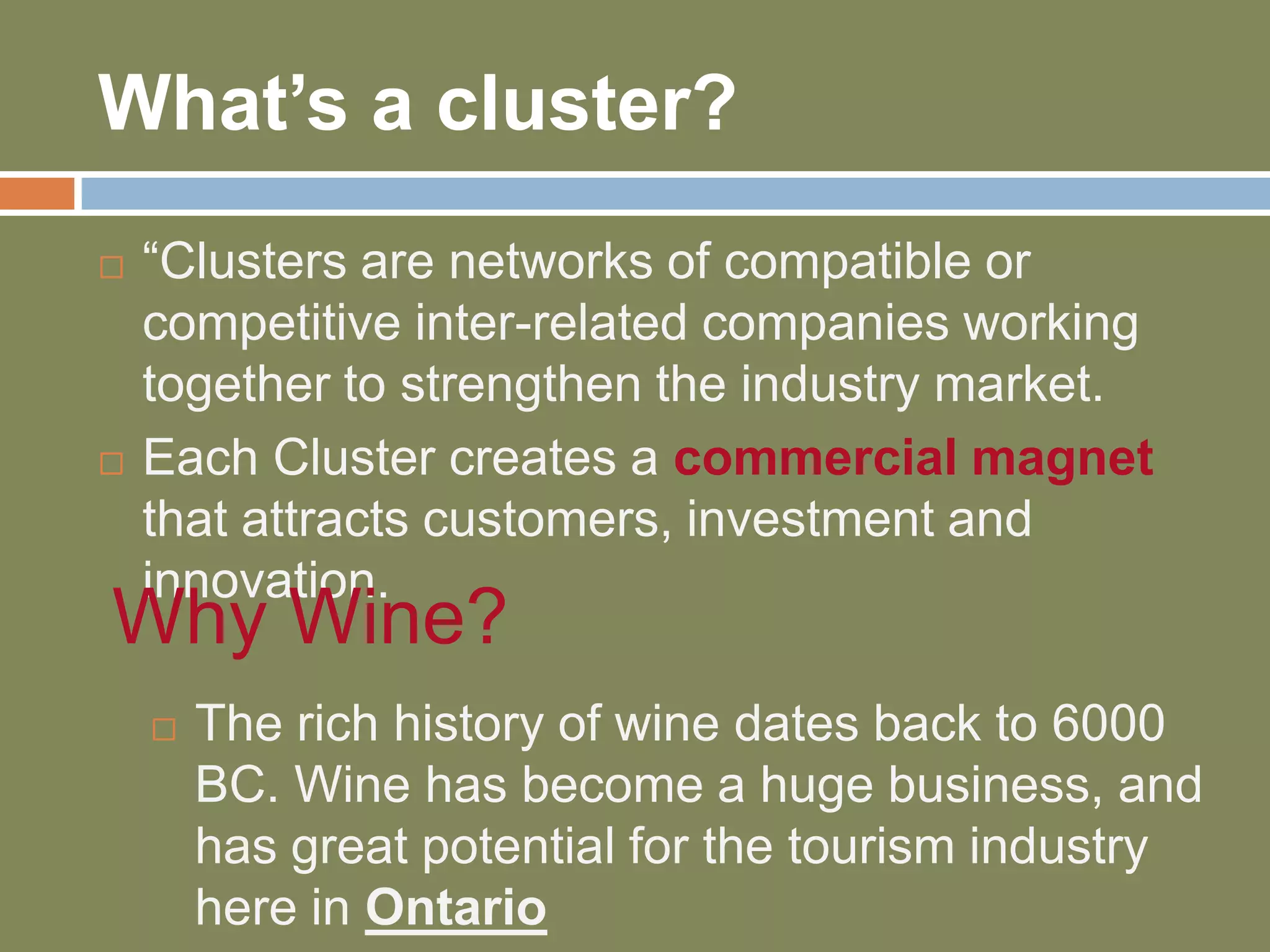 This document discusses wine clusters and provides examples of clusters in different regions. It focuses on the potential for a wine cluster in Ontario, Canada. The key points are: 1) Wine clusters connect related companies in the industry to strengthen the market and attract investment. 2) Ontario is well-suited for a wine cluster due to its viticultural areas and research institutions. 3) Developing a wine cluster in Ontario could help promote tourism and marketing of Ontario wines.