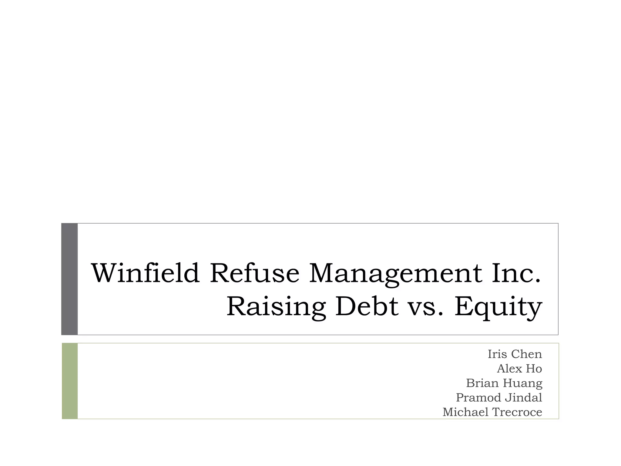 Winfield Refuse Management is considering financing options for a $125M acquisition of Mott-Pliese Integrated Solutions. The options considered are: 1) Debt with fixed principal repayments, 2) Debt only, 3) Equity, 4) Debt and equity. Debt only has the lowest NPV cost of financing, while equity has the highest. Debt options provide the highest expected earnings per share and return on equity under likely earnings scenarios. Monte Carlo simulations show Winfield can meet debt obligations and dividend payments under varying earnings outcomes for all financing alternatives. Winfield should finance through issuing bonds with no principal repayments.