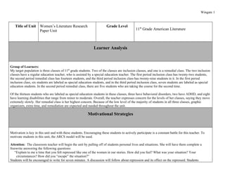 This document provides information on a unit plan for an 11th grade American Literature class focusing on a women's literature research paper. It includes an analysis of the diverse group of learners, motivational strategies using the ARCS model to gain students' attention, establish relevance and build confidence and satisfaction. Technology resources like the computer lab and Galileo database will be used. Essential questions are provided to guide students' research and writing on how women were repressed in 19th century literature and how to complete a research paper while avoiding plagiarism using reliable sources. State writing and research standards are also addressed.