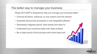 The document describes the 2013 ERP system designed to enhance business management by integrating various functions such as finance, sales, inventory, and production into a single web-based platform. It emphasizes the ability to automate business processes, perform deep data analysis, and maintain control through customizable dashboards and reports. Additionally, the software supports multi-branch operations and offers extensive features for budgeting, taxation, and inventory management.