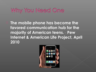 The document discusses teens' use of mobile phones for various purposes beyond phone calls. It notes that 83% use their phones to take pictures, 64% share pictures, 60% play music, 46% play games, 32% exchange videos, 31% exchange instant messages, 27% go online, and 23% access social networks. It also discusses some public libraries that have mobile websites and apps.