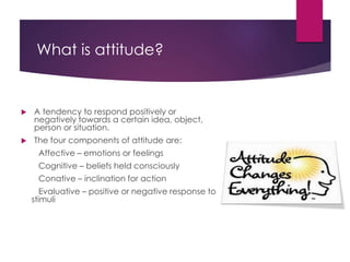 The document explores the concept of attitude, defining it as a response tendency and outlining its four components: emotional, cognitive, conative, and evaluative. It emphasizes the impact of environment and past experiences on attitudes and discusses the benefits of maintaining a positive attitude, including increased productivity and reduced stress. Lastly, the document provides steps to foster a positive attitude, highlighting personal responsibility and the importance of positive thinking.