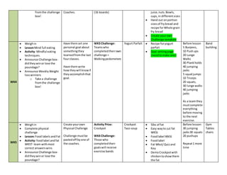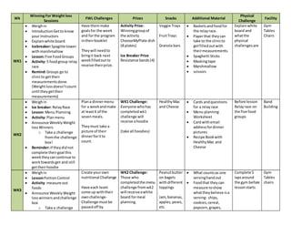 The document outlines the weekly sessions of a weight loss program over 8 weeks. Each week covers a different nutrition topic and includes a lesson, activity, and physical challenge. Participants are weighed in at the start of each session and prizes are given for completing weekly challenges and for greatest weight loss. The document provides details of the topics, activities, and materials needed for each of the 8 weekly sessions.