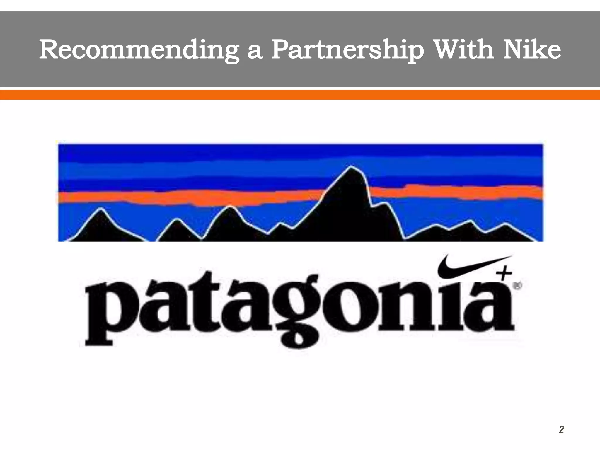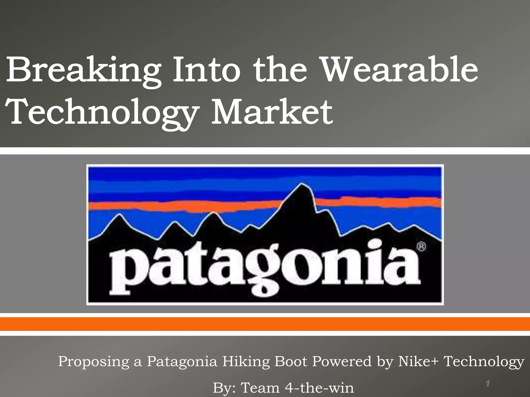 This document proposes a partnership between Patagonia and Nike to develop a hiking boot powered by Nike's wearable technology. It considers the wearable technology market, entry strategy, branding, and financial implications. Key points analyzed include developing the boot independently versus partnering with Nike, targeting different customer segments, marketing to promote sustainability, and minimizing effects on each company's brand. The recommendation is to partner with Nike to leverage its expertise while protecting Patagonia's brand, ensuring customer data ownership, and gaining access to Nike's customer base and technology at a lower investment risk.