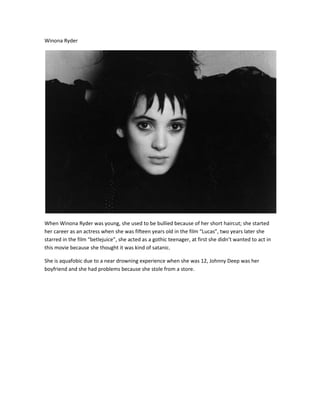 Winona Ryder was bullied as a child for her short haircut and began her acting career at age 15 in the film "Lucas." She starred two years later in "Beetlejuice" playing a gothic teenager but initially did not want the role because she thought the movie seemed satanic. Ryder has aquaphobia from nearly drowning at age 12, dated Johnny Depp, and faced legal issues for shoplifting.