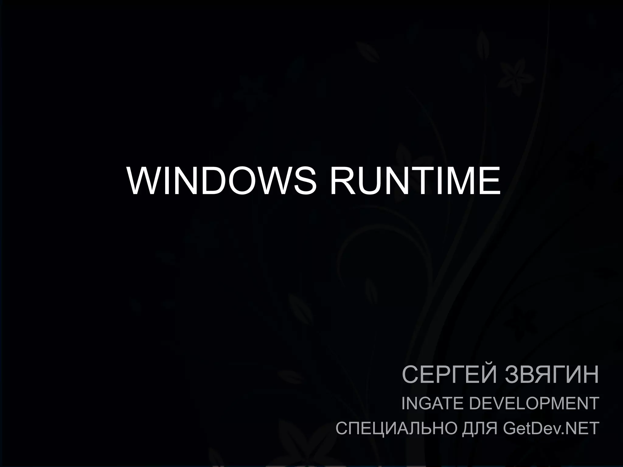 Документ предоставляет детальную информацию о Windows Runtime (WinRT) и его архитектуре для разработки Metro-приложений в Windows 8. Рассматриваются особенности платформы, возможности языков программирования, подходы к работе с компонентами и асинхронностью, а также рекомендации по портированию приложений. Документ также затрагивает вопросы выбора языка программирования и специфику разработки с использованием различных технологий.