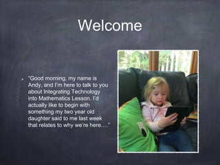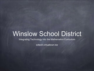 This document summarizes a presentation given to the Winslow School District about integrating technology into the mathematics curriculum. It provides an overview of educational technology tools for math including Google Forms, Spreadsheets, NearPod, Khan Academy, Gooru Learning, online chart tools, math simulations, and coding resources. It emphasizes that technology should support learning concepts and encourages teachers to add a technology component to a lesson using one of the tools presented.