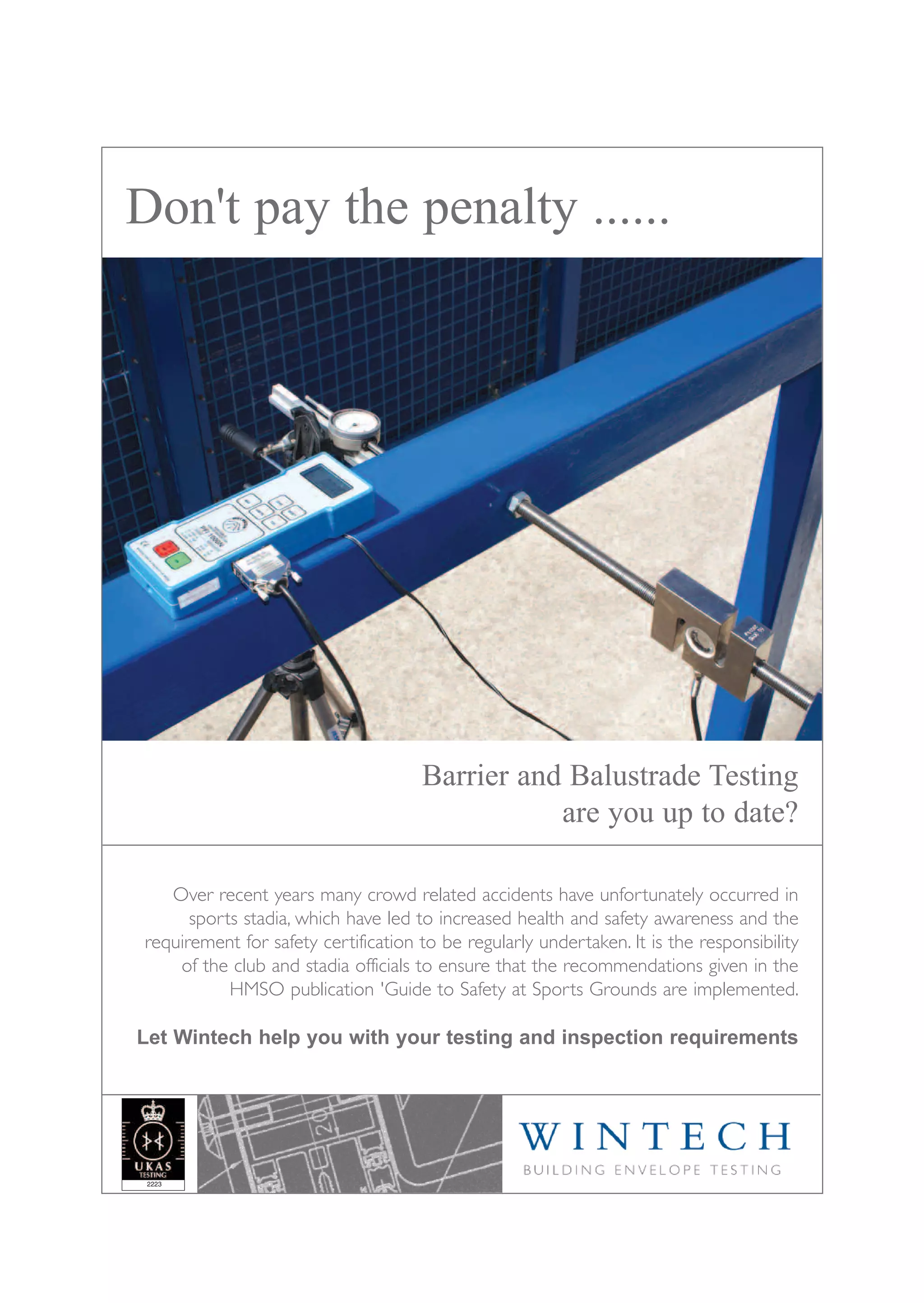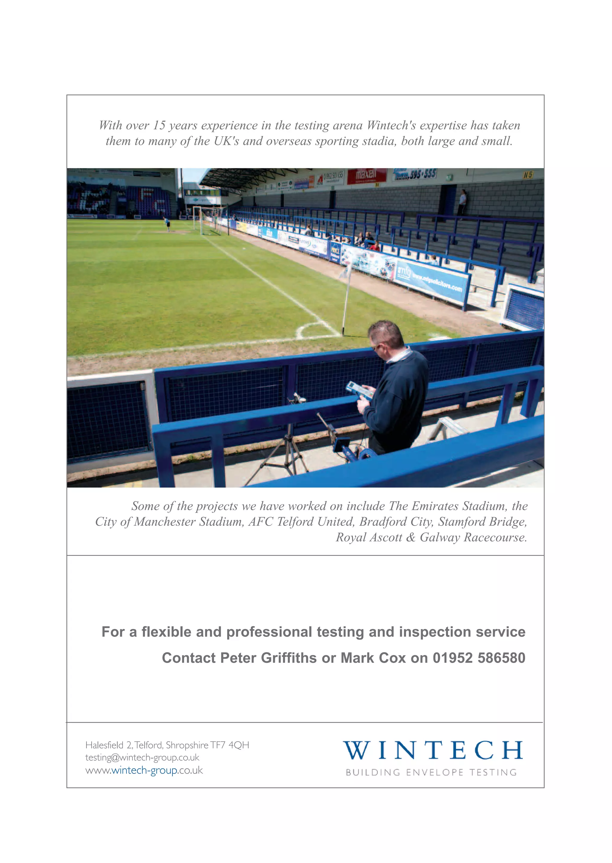 Wintech is a company that specializes in barrier and balustrade testing for sports stadiums to ensure safety compliance. They have over 15 years of experience performing testing at major UK stadiums like Emirates Stadium and Stamford Bridge, as well as smaller venues. If you need testing and inspection services, Wintech provides professional and flexible service with a history of working on various sporting projects.