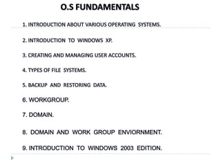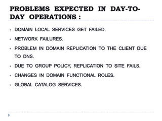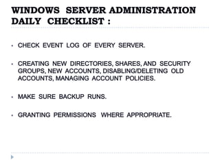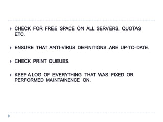The document provides an overview of various IT components and services, focusing on Active Directory and DNS within Windows Server environments. It covers the features, components, configurations, and management processes of DHCP and the comparisons between Wintel and Unix systems. Additionally, it addresses installation procedures and troubleshooting strategies related to these technologies.