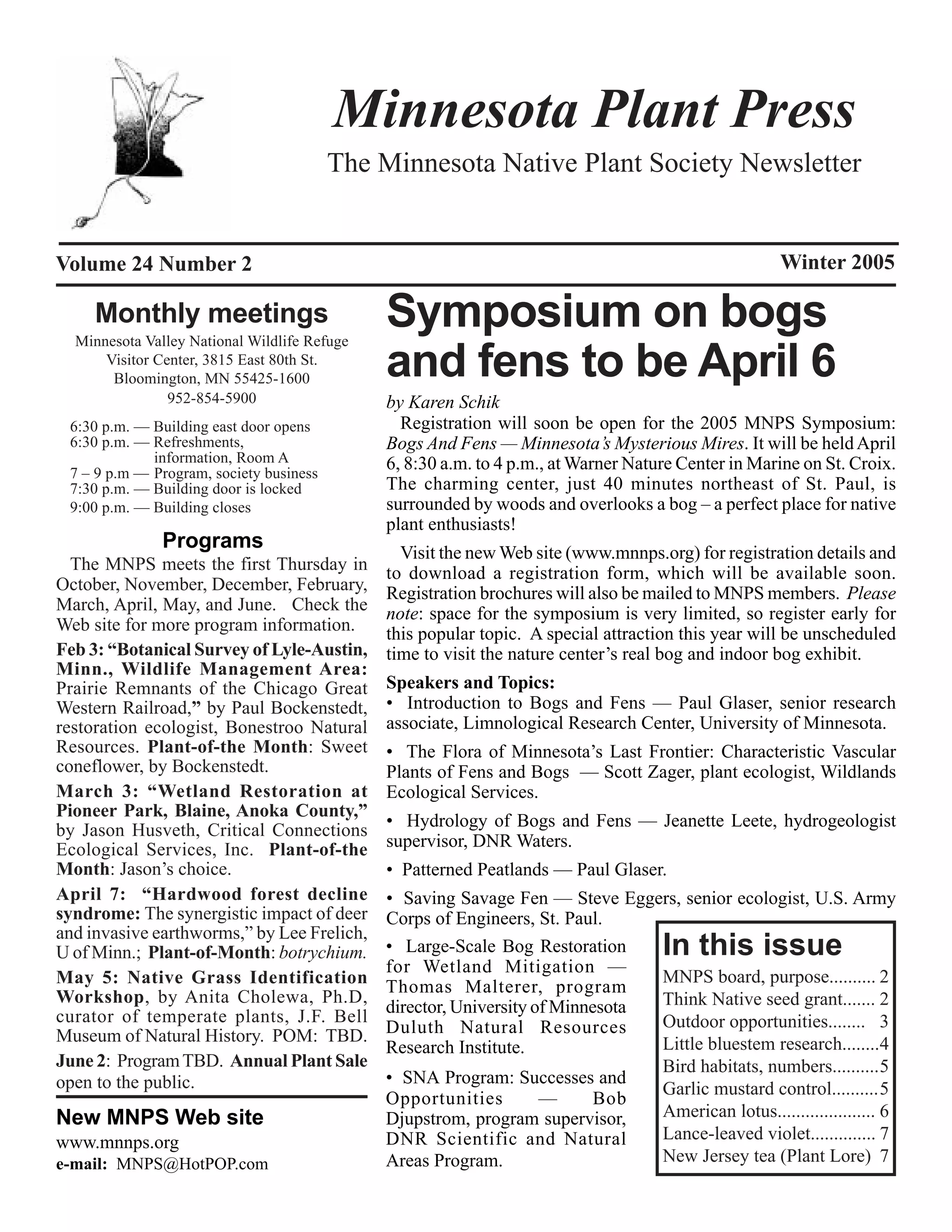This document summarizes the upcoming April 6th 2005 MNPS Symposium on Bogs and Fens to be held in Marine on St. Croix, MN. It provides details on registration, speakers, and topics which will focus on the ecology and conservation of bogs and fens in Minnesota. It also briefly describes the purpose of the Minnesota Native Plant Society to educate members and the public about conservation of native plants and plant sciences in Minnesota.
