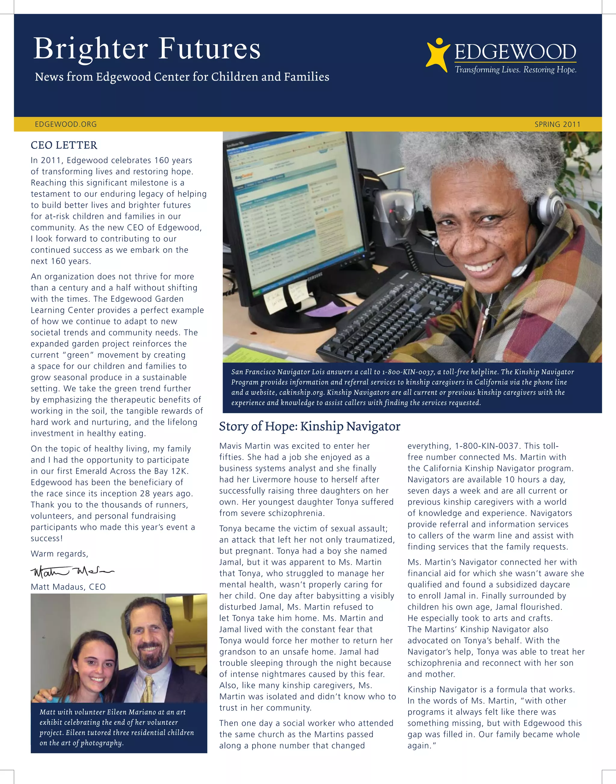 The CEO letter summarizes Edgewood's 160 years of helping at-risk children and families and looks forward to continued success. It also highlights the new Edgewood Garden Learning Center project, which will provide a sustainable space for children and families to grow food and connect with nature. The second article provides more details on plans to build out the Sally Gotcher Children's Garden and transform it into the Garden Learning Center, with partnerships helping to design, build, and fund the project. Programs across Edgewood will be able to utilize the new outdoor space.