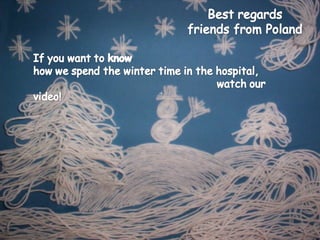 The document summarizes aspects of winter in Poland as seen through the window of a hospital. It notes that winter lasts from December 22nd to March 21st, with average temperatures between -6 and 0 degrees Celsius, though it can get as cold as -25 or -40 degrees. Children enjoy winter breaks from school and engaging in winter activities like building snowmen, sledding, skating, and skiing. Popular winter sports in Poland include ski jumping, biathlon, speedskating, figure skating, downhill skiing, cross-country skiing, snowboarding, and hockey. Famous Polish winter athletes are mentioned.