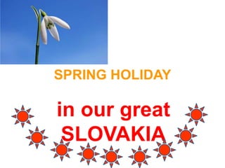 This document describes how different people in Slovakia spent their spring holiday, including time in nature, traveling, visiting family, and waking up from winter. It discusses a couple enjoying time with their son and daughter in Austria, as well as students waking up from winter and early spring flowers blooming, signaling the end of the spring holiday season.
