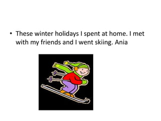 During their winter break, several students met with friends, went skiing, played in the snow, and played computer games and volleyball. However, one student had a difficult time as they spent a week sick in bed, playing games, watching TV, studying, and reading. Another student enjoyed playing with their daughters, going skiing with them, and playing games while laughing together.
