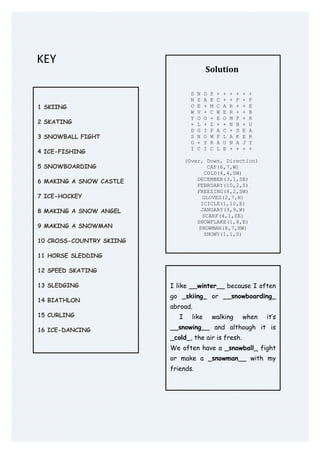1. The document contains a word search and matching activity about winter words and pictures of winter activities.