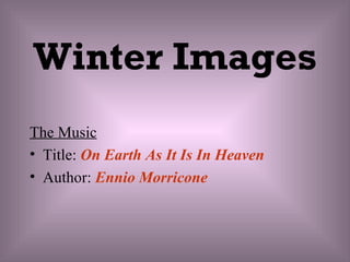 This document contains titles and descriptions of 22 winter landscape photographs from locations around the world, including Antarctica, Norway, Canada, the United States, Austria, Switzerland, Germany, Nepal, and Alaska. The photographs depict scenes of animals, landscapes, cities, and natural phenomena in winter settings. The background music suggested is "On Earth As It Is In Heaven" by Ennio Morricone.