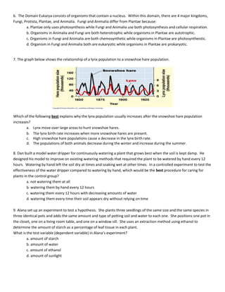 The document provides a biology EOC winter interim review assessment with multiple choice questions covering several biology topics including: genetics, cell biology, ecology, evolution, and photosynthesis and cellular respiration. The questions assess understanding of key concepts such as genetic inheritance patterns, cellular structures and functions, population dynamics, energy flow in ecosystems, and the processes of photosynthesis and cellular respiration.