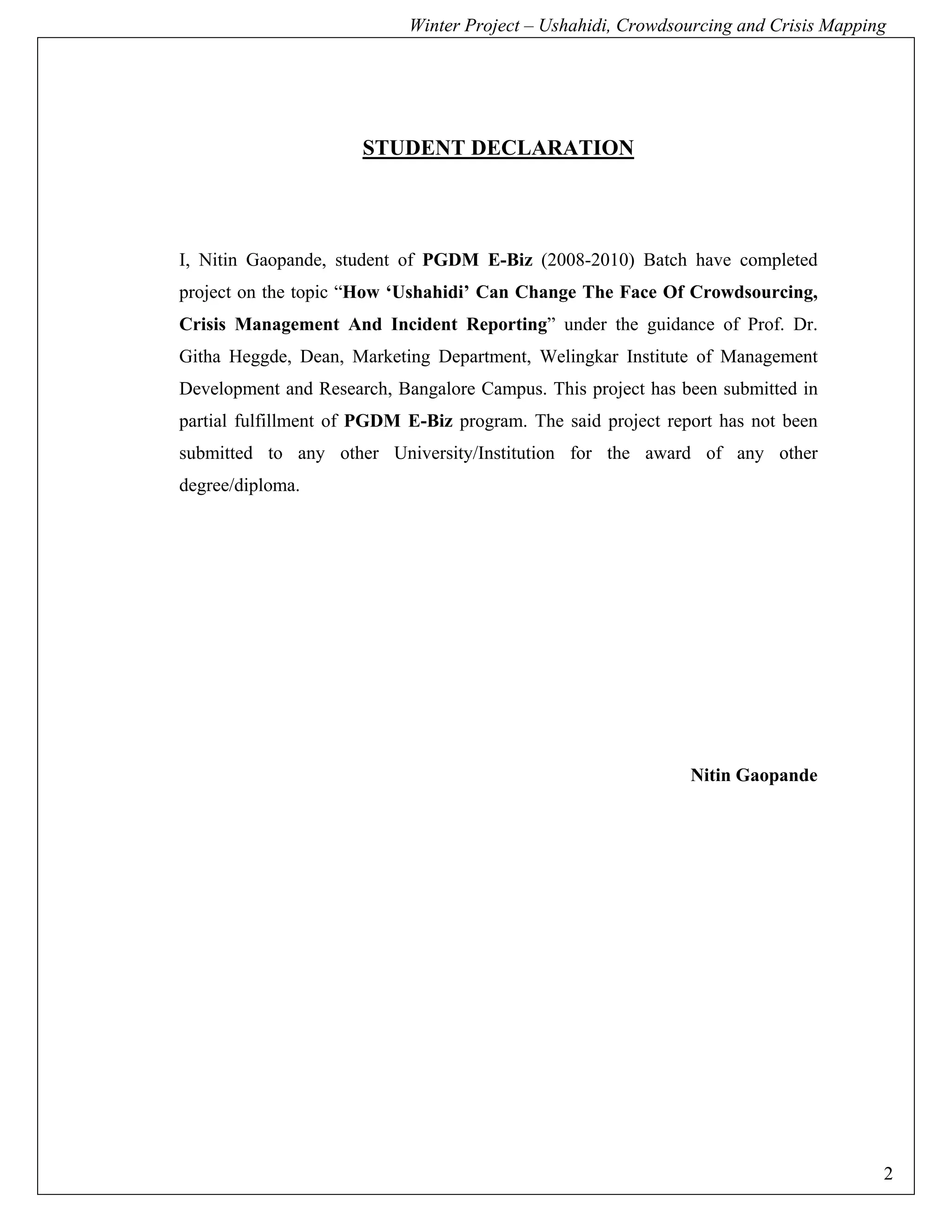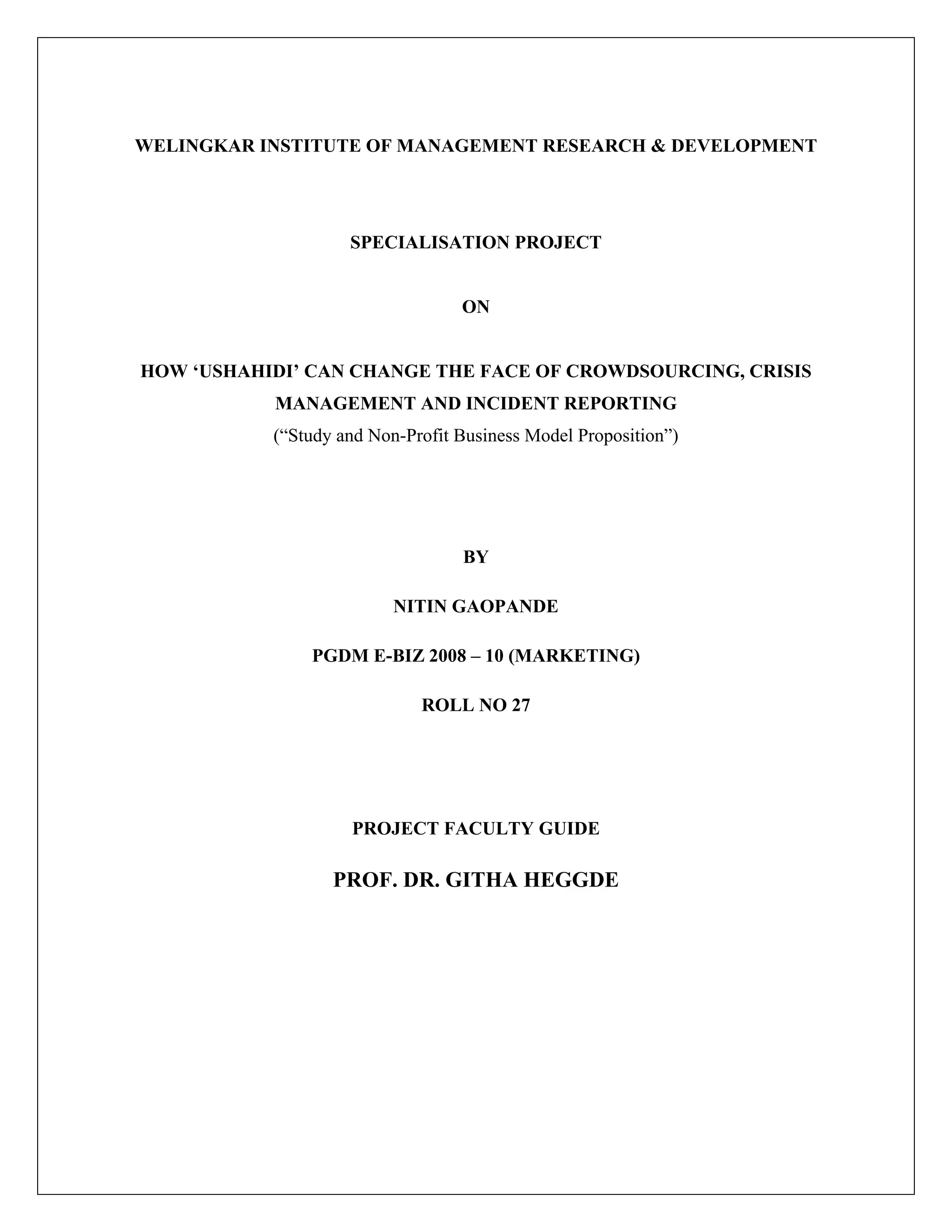 The document discusses the open source software platform Ushahidi, which allows crowdsourcing of information through various means such as SMS, email, and web forms. It provides a history of Ushahidi's development in Kenya and discusses its worldwide implementations for social causes and crisis mapping. The paper then proposes two models for implementing Ushahidi in India - Citizen Reporting at 737678 for non-emergency reporting and Pin Pointed Advertising for targeted local advertising. It analyzes the effectiveness of Ushahidi through a case study and discusses challenges of the platform.