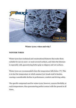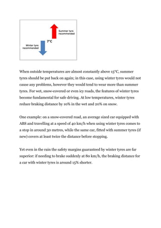 Winter tyres have technical features that make them suitable for snowy and icy conditions, providing better grip than summer tyres below 7°C. Their softer compound remains flexible at low temperatures. Winter tyres reduce braking distances in wet and snowy conditions compared to summer tyres. They should be used from autumn to winter as they can handle any road conditions without needing chains.