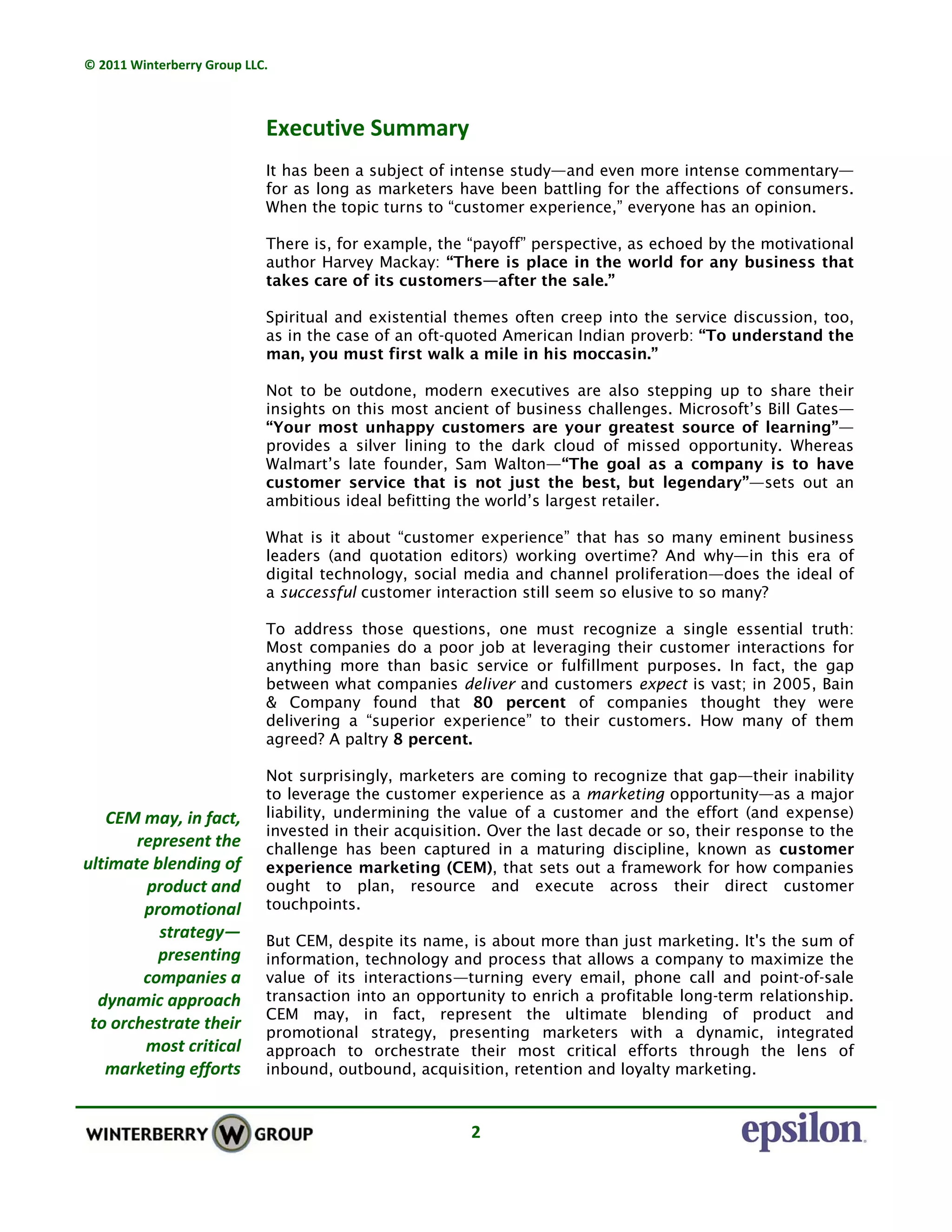 The document discusses Customer Experience Marketing (CEM) as a vital approach for companies to enhance interactions with customers, bridging gaps between marketing, sales, and technology. Despite the recognition of CEM's importance, many businesses struggle to implement effective strategies and allocate resources due to organizational challenges. The paper highlights key trends shaping CEM's future, emphasizing the need for improved multichannel experiences and better use of customer data to drive profitable relationships.