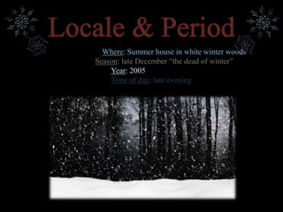 The document provides details on the set design for the play "Wintertime" by Charles Mee, including descriptions of the setting, layout of the set, scene design elements, and the mood and style. The set takes place in a summer house in a winter woods and is designed so that the indoors and outdoors occupy the same space. Key elements include birch trees, lightly falling snow, hanging icicles, and furniture draped in white muslin for Act 1 and black for Act 2. The set aims to create a sense of warmth and comfort to immerse the audience in the play's themes of love and romance set in the winter season.