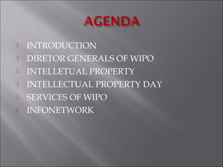 The document summarizes the World Intellectual Property Organization (WIPO). WIPO is a UN agency dedicated to intellectual property protection. It has 187 member states and administers 26 treaties. Francis Gurry is the current Director General. WIPO provides global intellectual property services, sets international IP policy and standards, and facilitates international cooperation on IP issues. It aims to promote creativity and technological innovation for the benefit of all.