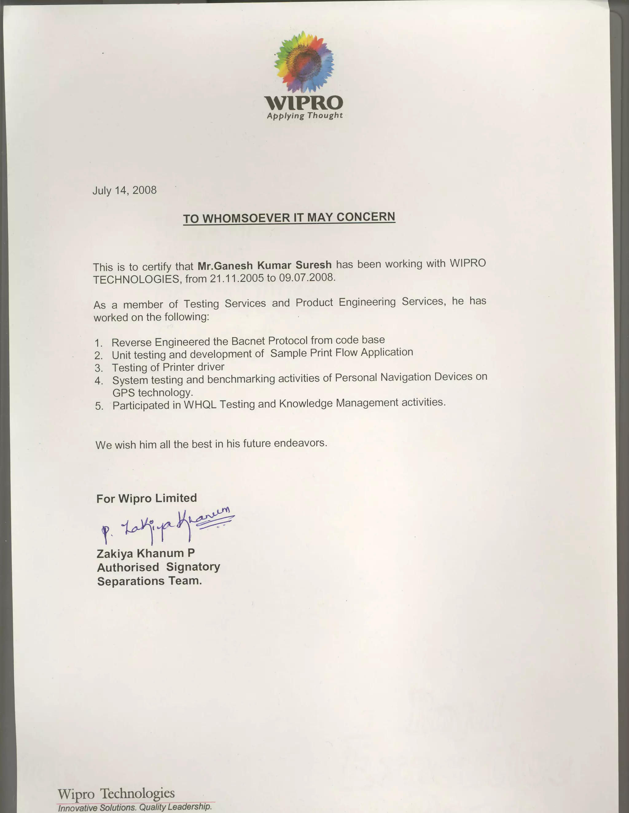 Mr. Ganesh Kumar Suresh worked at Wipro Technologies from July 2005 to July 2008. During his time there, he worked on reverse engineering the Bacnet protocol from codebase, unit testing and developing a sample print flow application, testing printer drivers, system testing and benchmarking personal navigation devices on GPS technology, and participating in WHQL testing and knowledge management activities. Wipro Technologies wishes him the best in his future endeavors.