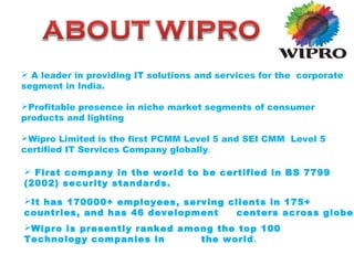 Wipro is a global IT, consulting and business process services company with over 175,000 employees serving clients in over 175 countries. It is the first IT services company globally to achieve both PCMM Level 5 and SEI CMM Level 5 certifications. Wipro has 46 development centers across the globe and is ranked among the top 100 technology companies worldwide. It started as a vegetable oil company in 1947 and transitioned to IT services in the 1970s, becoming a leader in providing IT solutions and services for corporate clients in India.