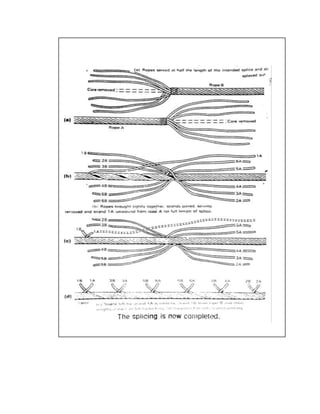 The document provides a comprehensive overview of wire ropes used in various engineering applications, detailing their construction, types, testing methods, and maintenance. Wire ropes are critical materials in mining and other industries, characterized by their tensile strength and various configurations, including stranded and non-stranded types. Key aspects covered include applications in mining operations, factors influencing safety, and methods for care, maintenance, and splicing of wire ropes.