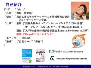 INC. All Rights Reserved WiredTigerを詳しく説明 2017/09/13 MongoDB勉強会 in 2017 コンサルタント 渡部 徹太郎 1