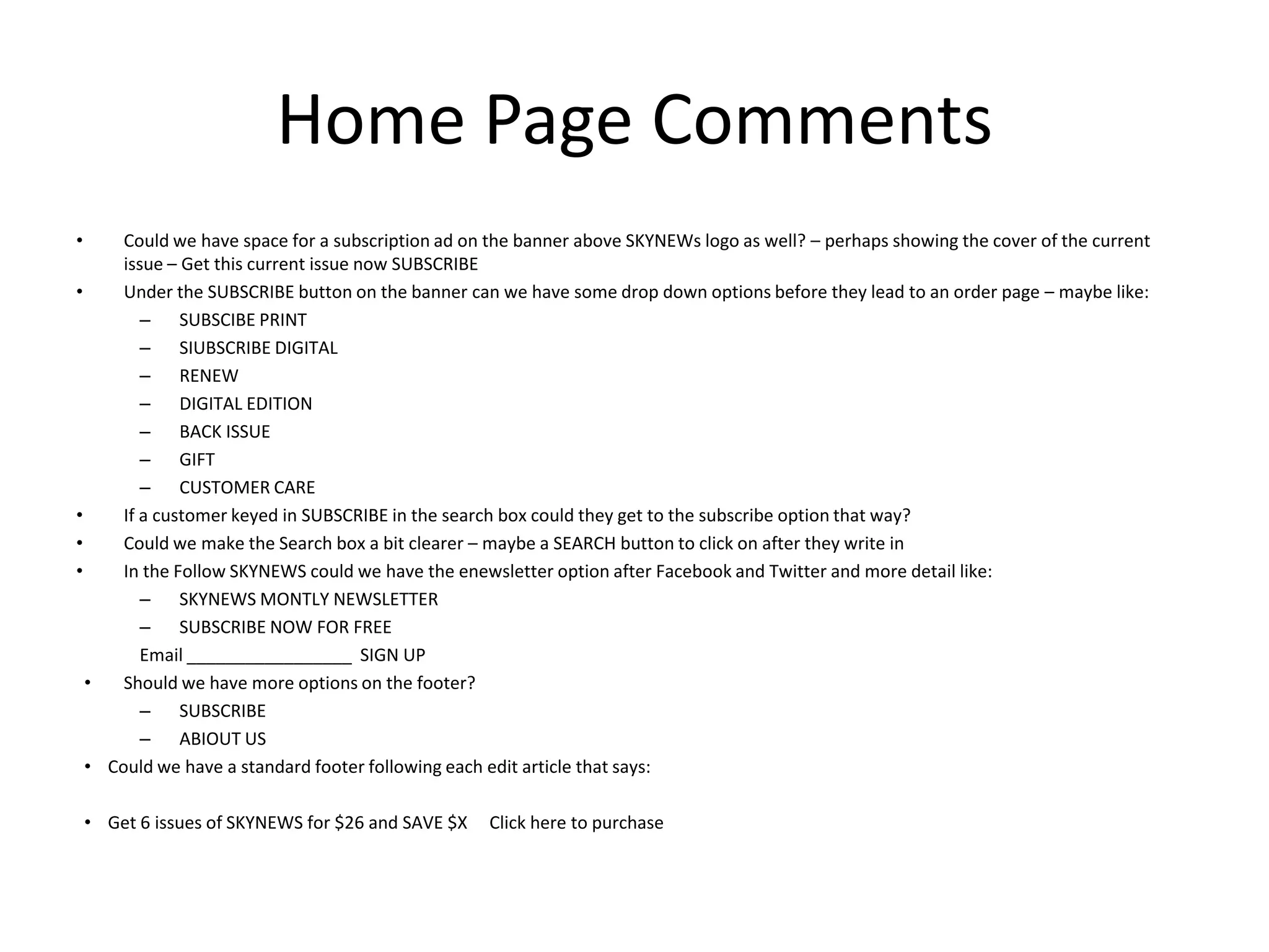 The document provides suggestions for improving the homepage of a website called SKYNEWS. It recommends adding a subscription ad banner, dropdown options under the subscribe button for different subscription types, and making the search box clearer. It also suggests adding an email newsletter signup and standard footer to articles promoting subscriptions. Additional footer links and a contact us tab are proposed.