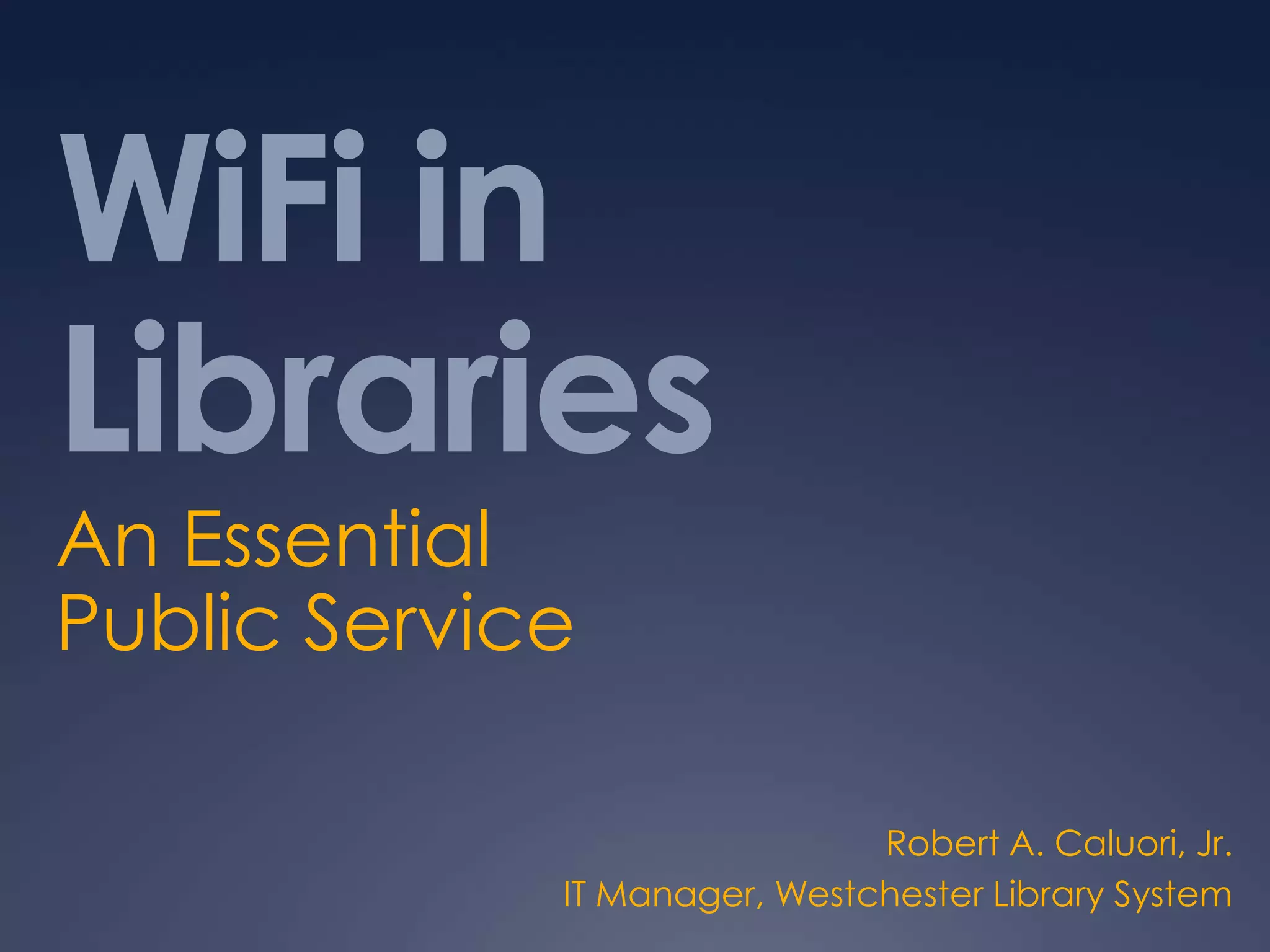The Westchester Library System needed to upgrade its 7-year-old WiFi infrastructure to meet rising demand without increasing costs. It implemented a Cisco wireless solution with access points and a controller to provide remote management, scalability, and usage statistics. The network design included Cisco firewall equipment to enable private network features over the public internet using a VPN. This allows the library to control the number of users, enforce bandwidth limits, and gain valuable insights from usage statistics - all while saving staff time on issue diagnosis through remote monitoring.