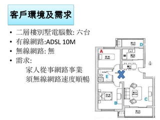 文档提供了针对一座两层别墅的无线网络建议,推荐使用 corega wlbarn20 无线接入点,因其稳定性高及多种功能;同时,评估了 ruckus mediaflex 2825 的表现,具有出色的信号覆盖和速度。主要考虑客户环境与需求,以确保家人从事网络事业时的顺畅体验。