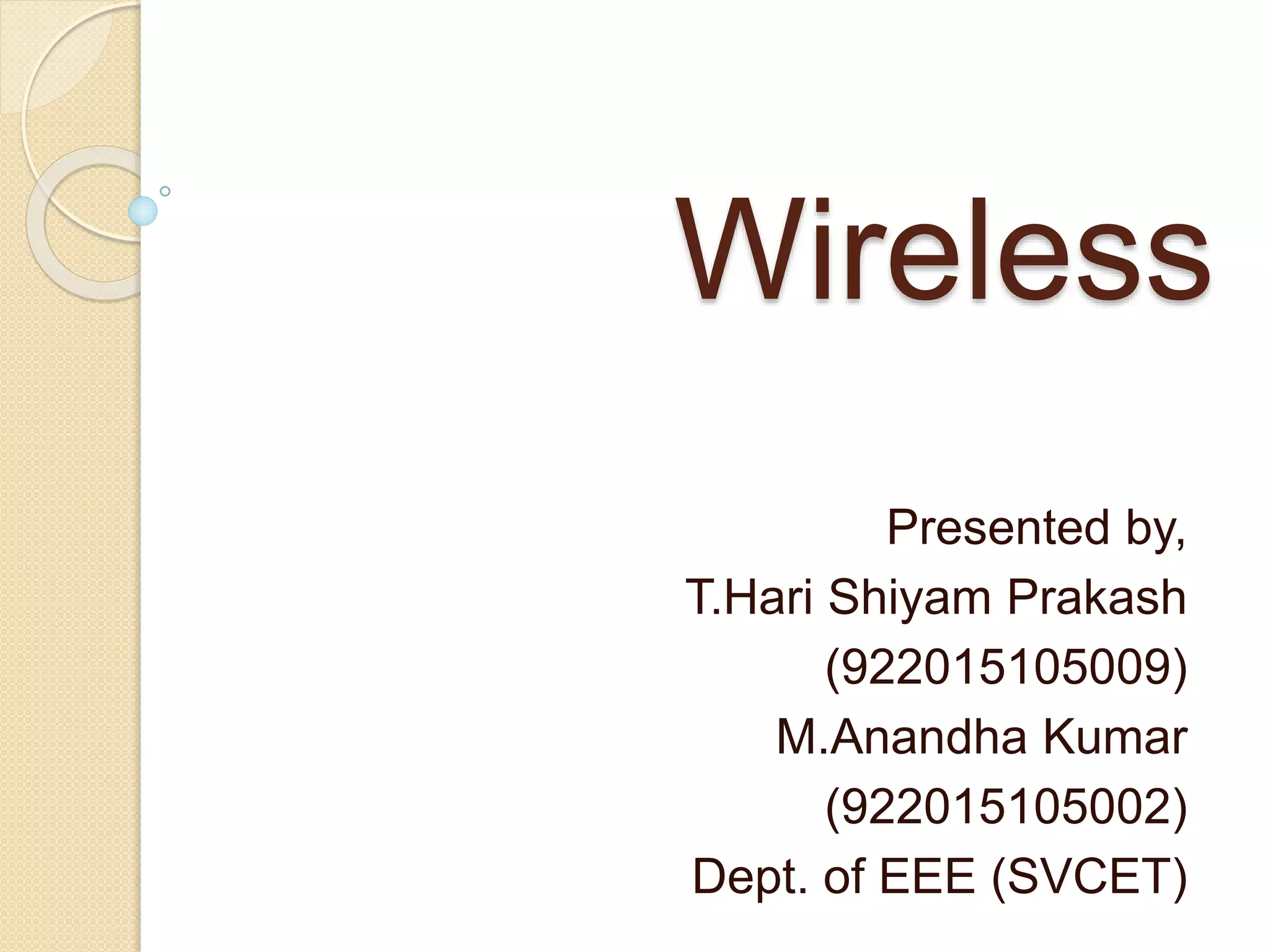 This document discusses wireless power transmission (WPT). It begins with an overview and objectives, then discusses the history of WPT from Tesla's experiments in the late 19th century. The document explains that WPT works via magnetic or inductive coupling and describes various methods like atmospheric conduction, microwave transmission, and laser transmission. It notes applications like electric vehicle charging and transmitting power to remote areas. In closing, it outlines advantages like efficiency and flexibility and disadvantages like high initial costs.